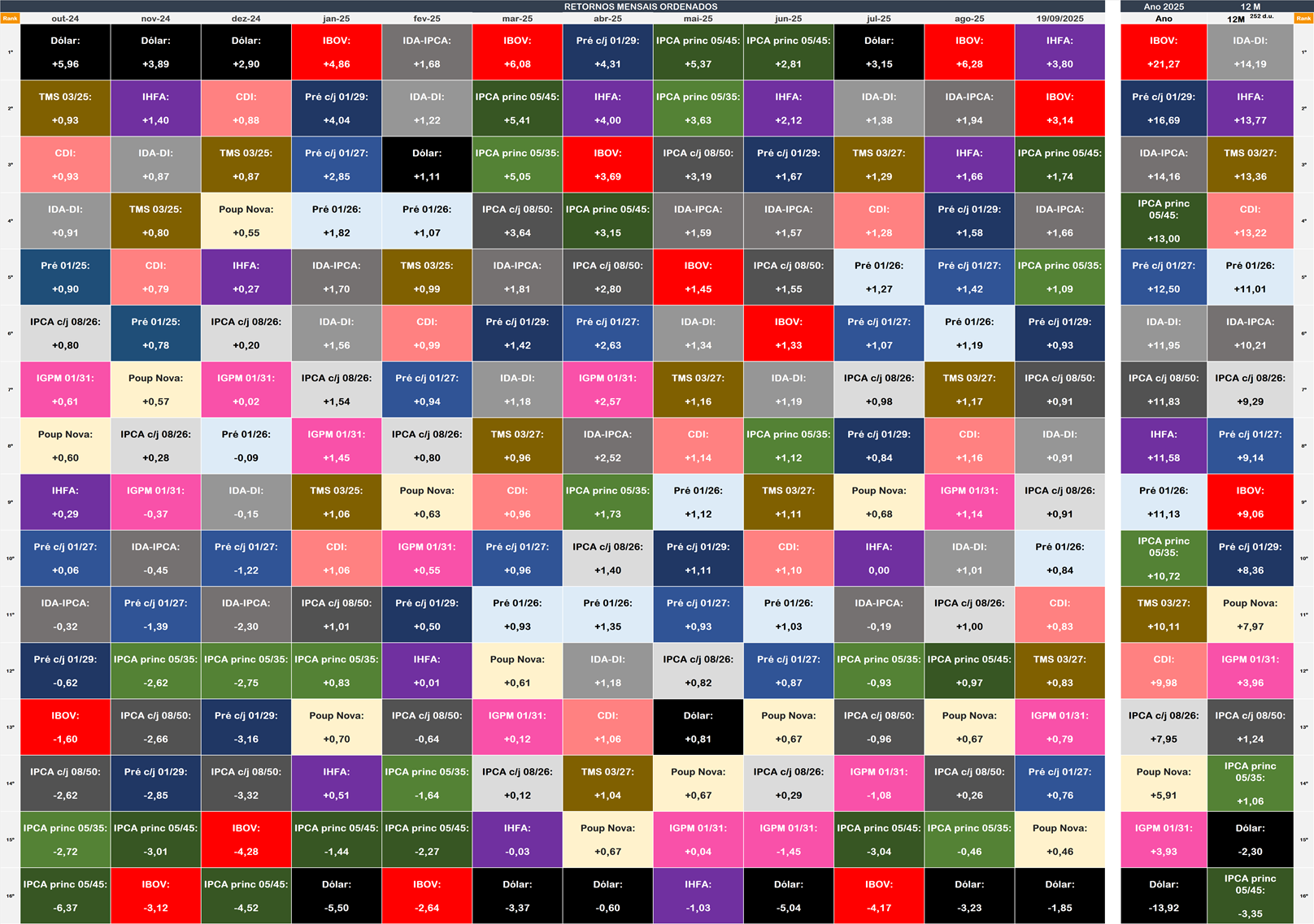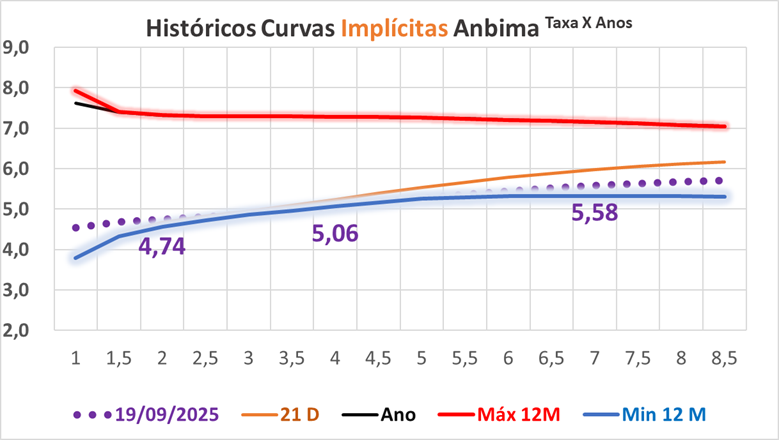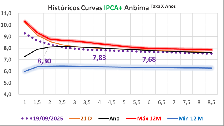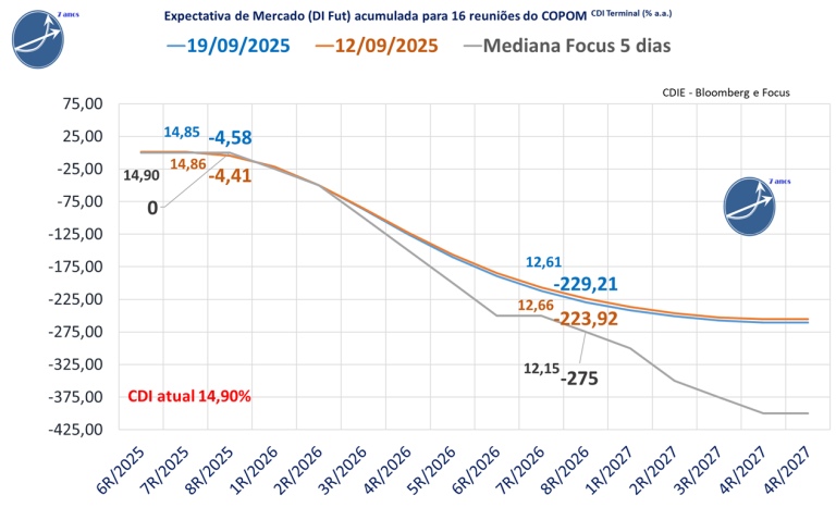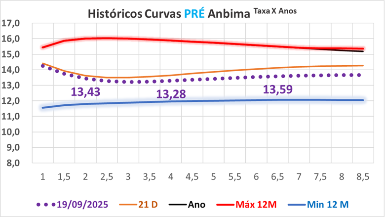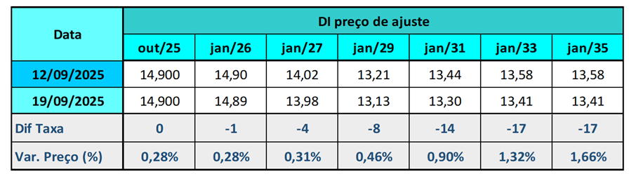 Principal(is) vetor(es): Durante a semana de 15 a 19 de setembro de 2025, o mercado de renda fixa brasileiro apresentou uma trajetória marcada por volatilidade e ajustes, com influência significativa de fatores internos e externos. No início da semana, os juros futuros recuaram diante da expectativa de corte de juros pelo Federal Reserve (Fed) e da valorização do real, enquanto dados fracos de atividade econômica local reforçaram a percepção de desaceleração, sem alterar significativamente as apostas para a Selic. Na terça e quarta-feira, o otimismo com o início do ciclo de cortes nos EUA sustentou a queda das taxas, embora a decisão do Fed tenha sido considerada menos “dovish” do que o esperado, limitando o movimento. A partir de quinta-feira, o tom mais duro do Comitê de Política Monetária (Copom), que manteve a Selic em 15% e sinalizou cautela quanto a cortes, provocou alta nos DIs, especialmente nos vértices curtos. A sexta-feira consolidou esse ajuste, com os investidores digerindo riscos fiscais e o aumento dos rendimentos dos Treasuries. Apesar das pressões, a curva de juros local teve leve queda no saldo semanal, com redução nas taxas dos vencimentos mais longos, refletindo a expectativa de que uma postura mais rígida hoje possa abrir espaço para cortes mais agressivos em 2026.