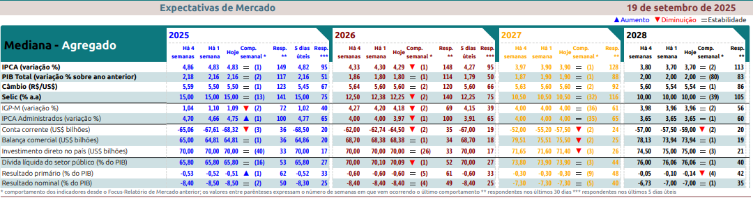 No Relatório de Mercado Focus da semana, a projeção para a inflação oficial de 2025 caiu de 4,83% para 4,83%. Há um mês, a mediana era de 5,09% , acima do intervalo de tolerância superior, que vai até 4,50%, e do alvo central de 3,0%. Para 2026, a projeção caiu de 4,30% para 4,29%, enquanto há um mês estava em 4,44%.