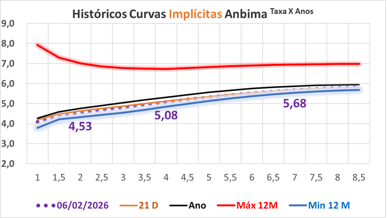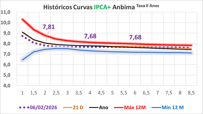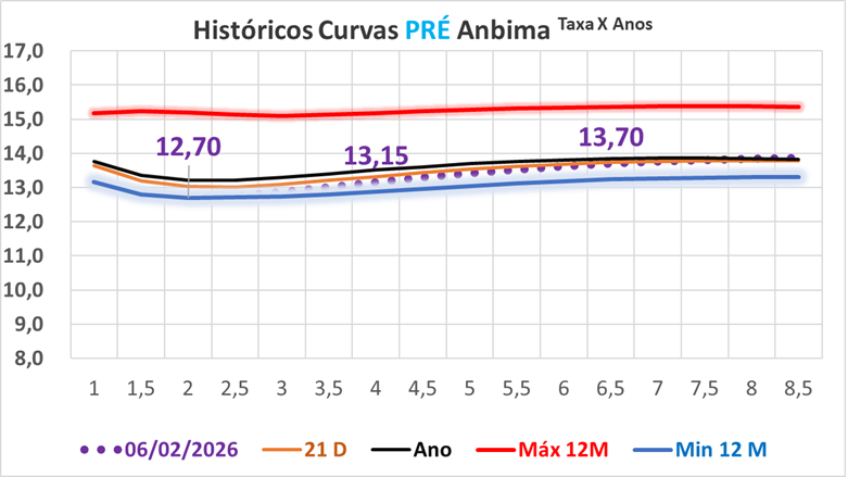 Os juros futuros registraram forte inclinação da curva, com aceleração das altas nos vértices longos após notícia de que a bancada do PT na Câmara pretende propor mudanças constitucionais para reduzir a autonomia operacional do Banco Central, em reação às irregularidades no banco Master, o que levou as taxas longas a renovarem máximas intradia por volta das 15h30. Embora o mercado considere improvável que a proposta avance, o ruído político foi suficiente para gerar um movimento de bull steepening em um dia de agenda econômica esvaziada, enquanto a ponta curta recuou levemente, sustentada pela elevada confiança na expectativa de um corte de 50 pontos-base na Selic em março. No acumulado da semana, a curva apresentou ganho de inclinação, com queda de 12 pontos-base no DI 2027 após a ata do Copom, enquanto os vértices de 2029 e 2031 abriram diante do estresse causado pela possível indicação de Guilherme Mello ao BC. Projeções atualizadas do Santander reforçaram a visão de que a Selic deve terminar o ano em torno de 12%, e o ambiente externo, apesar de mais positivo após o dado de confiança da Universidade de Michigan, teve influência residual dentro do contexto doméstico dominante.