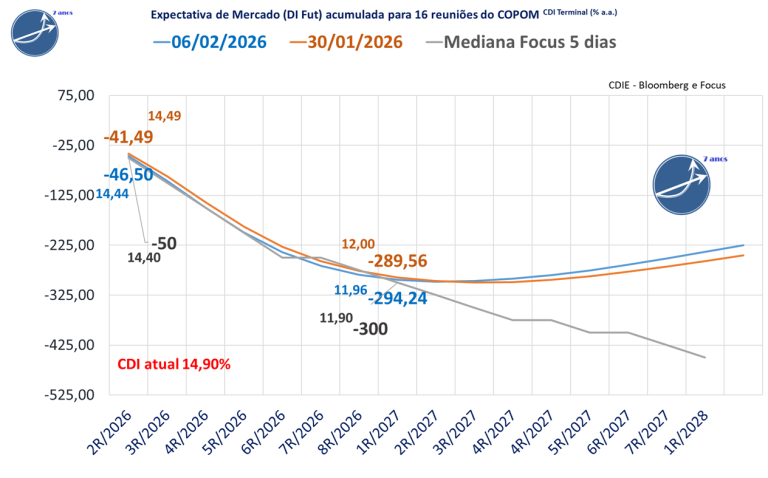 Para as próximas 8 reuniões do Copom,a expectativa de corte alterou marginalmente de -276,7 para -284,5 pontos-base, com o CDI projetado para o fim de 2026 em 12,06%, ante 12,13% na semana anterior.