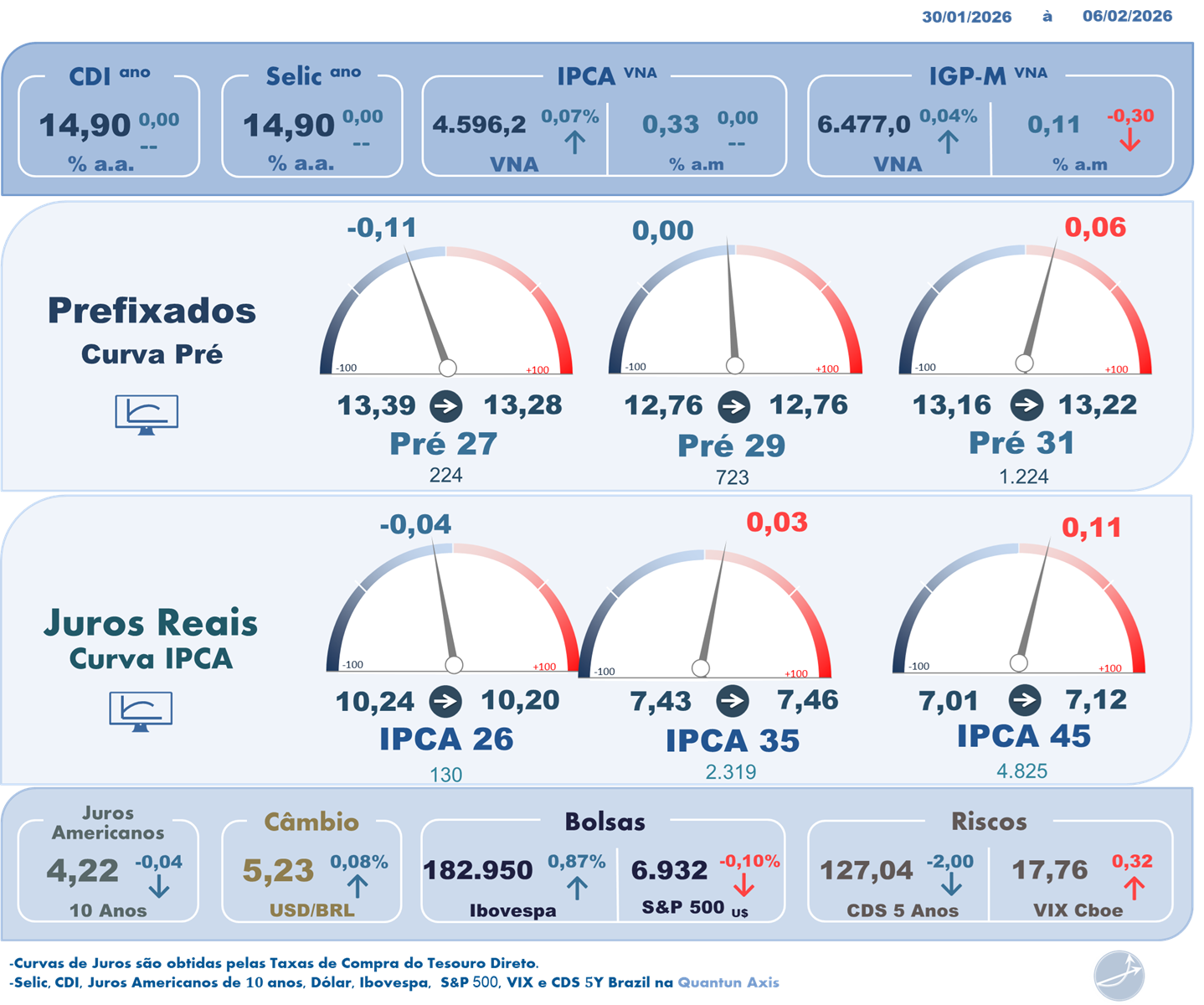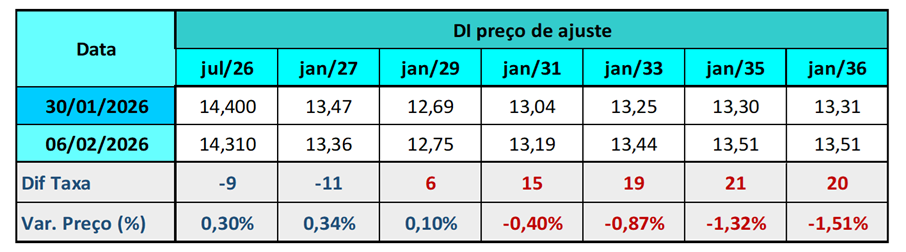 A curva a termo ganhou inclinação moderada, com altas de até 10 pontos-base nos trechos médios e longos, enquanto a ponta curta operou estável, refletindo a reversão do dólar que se fortaleceu ao longo do dia e renovou a pressão sobre os DIs. O mercado reagiu de forma mista às notícias fiscais, em especial ao projeto aprovado no Congresso que amplia cargos e gratificações no Executivo, somado ao desconforto pela confirmação da indicação de Guilherme Mello para a diretoria de Política Econômica do BC, cargo considerado estratégico. Gestores avaliaram que, embora o impacto fiscal imediato seja pequeno, a combinação entre ruídos políticos, ambiente externo negativo e ajustes técnicos após forte fechamento de janeiro justificou o movimento de alta nos vértices longos. Apesar disso, a variação das taxas permaneceu dentro da volatilidade diária típica, enquanto o mercado segue cético quanto a um ciclo de corte superior a 300 pontos-base, permanecendo sensível a qualquer sinal de deterioração fiscal ou interferência na autoridade monetária.