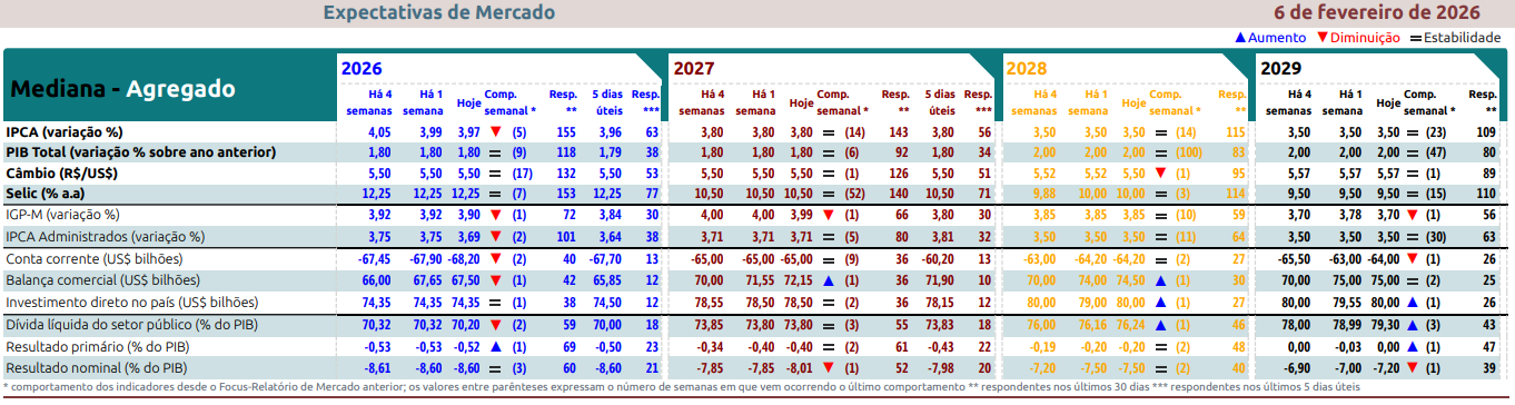 No Relatório de Mercado Focus da semana, a projeção para a inflação oficial de 2026 caiu de 3,99% para 3,97%. Há um mês, a mediana era de 4,44% , acima do intervalo de tolerância superior, que vai até 4,50%, e do alvo central de 3,0%. Para 2027, a projeção caiu de 3,80% para 3,80%, enquanto há um mês estava em 4,00%.