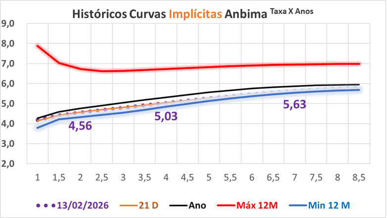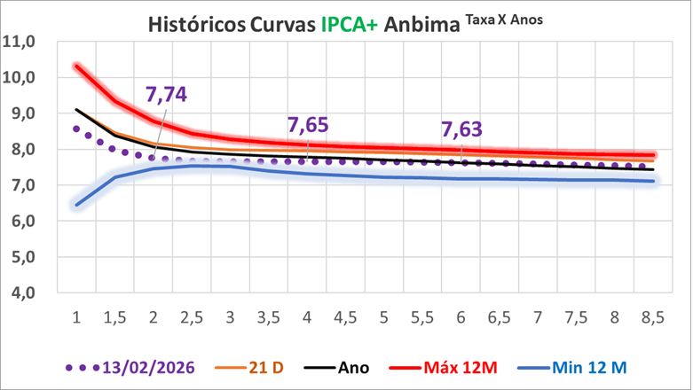 A terça-feira começou com viés benigno para a curva de juros, sinalizando novo movimento de achatamento, com estabilidade relativa dos vértices curtos e queda das taxas longas, apoiadas por cenário externo favorável, dólar comportado, recuo dos rendimentos dos Treasuries e um IPCA de janeiro praticamente em linha com as expectativas, ainda que com composição desfavorável. No entanto, o quadro se deteriorou no fim do pregão, quando as taxas a partir de janeiro de 2028 passaram a renovar máximas intradiárias, movimento associado principalmente a declarações de Mansueto Almeida, economista-chefe do BTG Pactual, durante evento com CEOs, nas quais destacou o elevado desafio fiscal do País, projeções de déficit nominal elevado e juros reais de longo prazo considerados insustentáveis. O discurso reforçou preocupações com o fiscal no horizonte pós-2027 e estimulou postura mais defensiva dos investidores, potencializada pela expectativa da divulgação de nova pesquisa eleitoral. Apesar disso, a leitura do IPCA foi considerada neutra para a política monetária, mantendo elevada a probabilidade de corte de 50 pontos-base da Selic em março, com a taxa terminal projetada ao redor de 12,15% em 2026, enquanto persistem incertezas sobre a extensão do ciclo de afrouxamento no longo prazo.