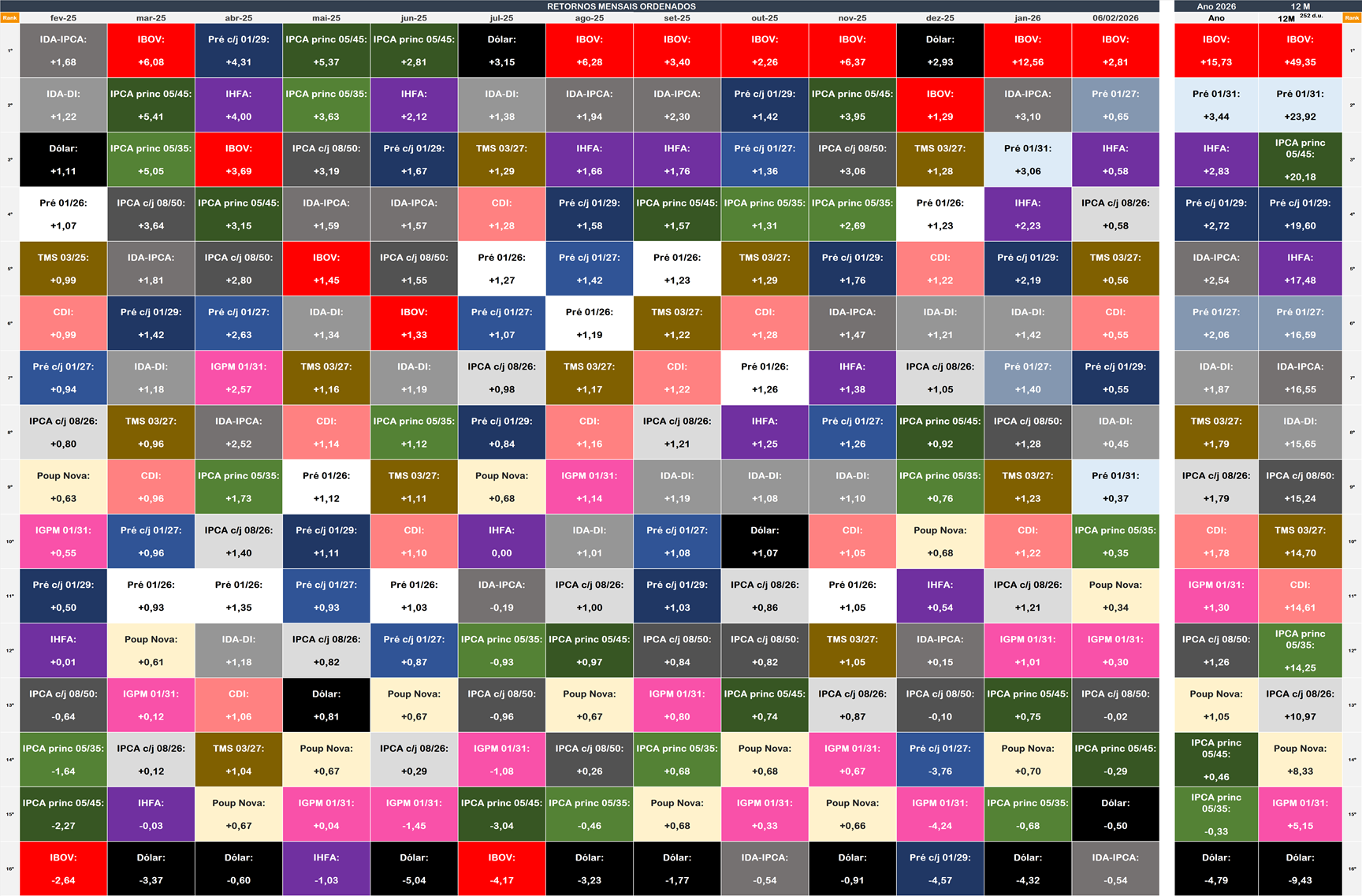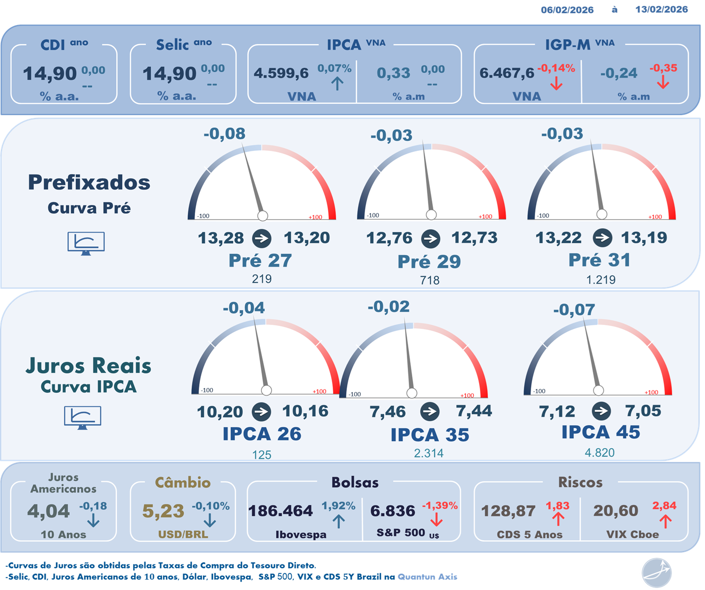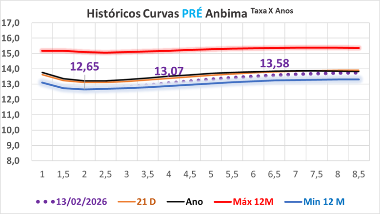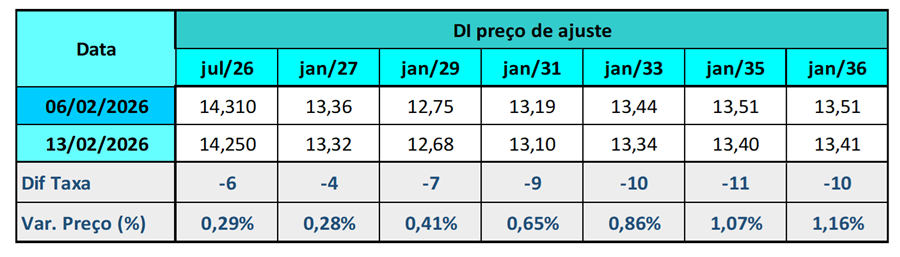 Na sexta-feira, véspera do feriado de Carnaval, a curva de juros futuros exibiu comportamento lateral e se destacou como o ativo doméstico mais resiliente, apesar do avanço do dólar e da performance fraca da Bolsa. Em um pregão de baixa liquidez e sem gatilhos relevantes, os investidores adotaram postura defensiva típica de períodos prolongados sem negociação, o que manteve oscilações contidas ao longo de toda a sessão. A ponta curta chegou a sair do terreno negativo e tocar máximas intradiárias no fim do dia, mas sem força suficiente para se descolar dos ajustes anteriores, enquanto os vértices longos foram levemente beneficiados pelo alívio vindo do exterior. Nos Estados Unidos, a divulgação do CPI abaixo das expectativas levou à queda dos yields dos Treasuries, o que ajudou a ancorar os juros futuros no Brasil, especialmente nos vencimentos mais longos. No cenário doméstico, a queda acima do previsto das vendas no varejo em dezembro reforçou a percepção de perda de fôlego da atividade no fim de 2025, mas teve impacto limitado sobre a curva, já que o mercado segue mais atento aos dados do início de 2026. No balanço semanal, observou-se redução da inclinação da curva, com maior recuo nos juros longos, refletindo a combinação de atividade doméstica mais fraca, expectativa de início do ciclo de cortes da Selic em março e influência externa favorável, ainda que o tom cauteloso do Banco Central e a incerteza fiscal sigam restringindo movimentos mais amplos.
