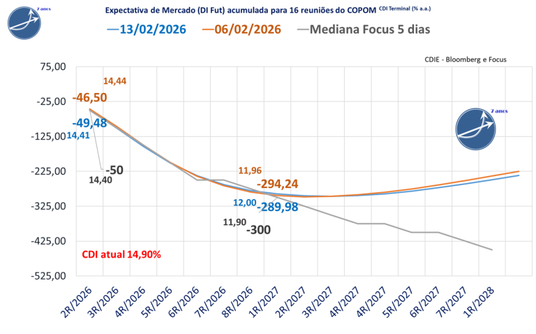 Para as próximas 8 reuniões do Copom,a expectativa de corte alterou marginalmente de -284,5 para -280 pontos-base, com o CDI projetado para o fim de 2026 em 12,10%, ante 12,06% na semana anterior.