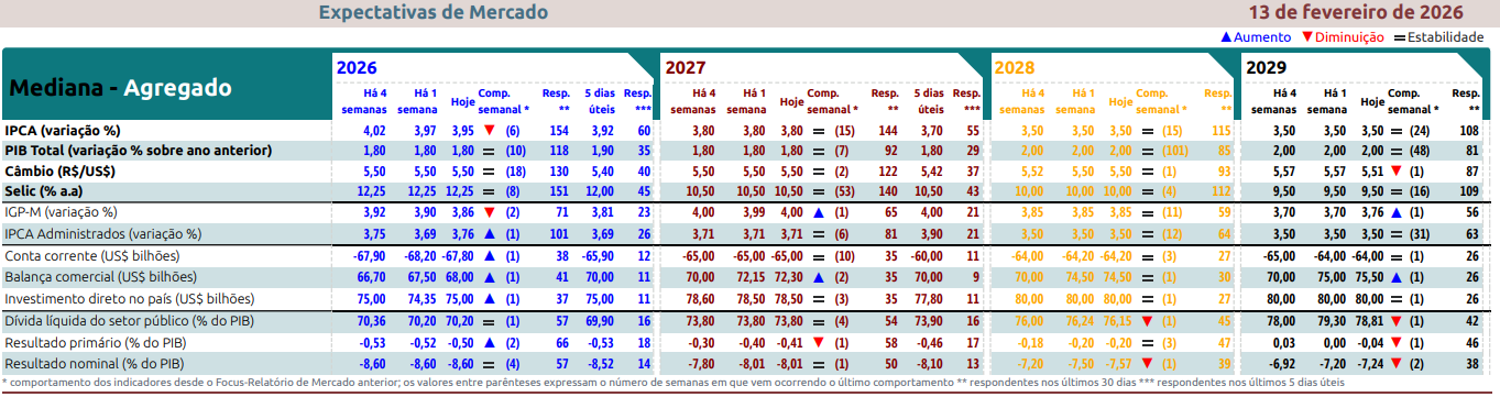 Para 2026, a mediana Focus aponta um CDI terminal de 12,15%, equivalente a -275 pontos-base de corte. .
