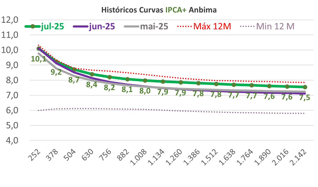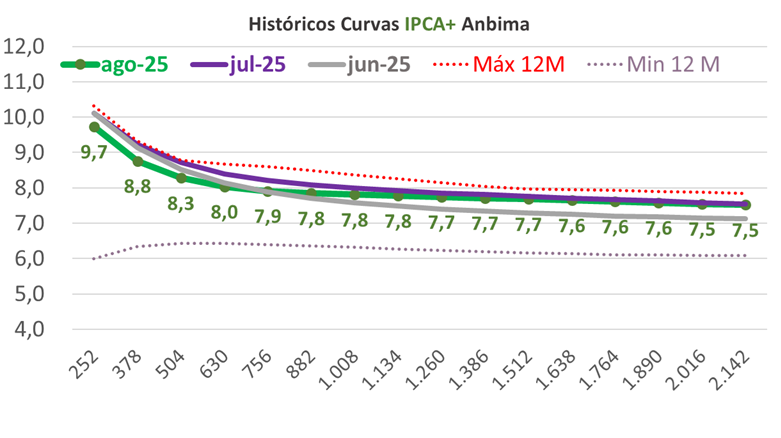 O mês também contou com a efetivação do tarifaço às exportações brasileiras e o acompanhamento da aplicação da Lei Magnitsky ao ministro do Supremo Tribunal Federal (STF), Alexandre de Moraes, além de dados mostrando que a atividade e a inflação brasileira estão indo na direção que o Banco Central e mercado gostariam.