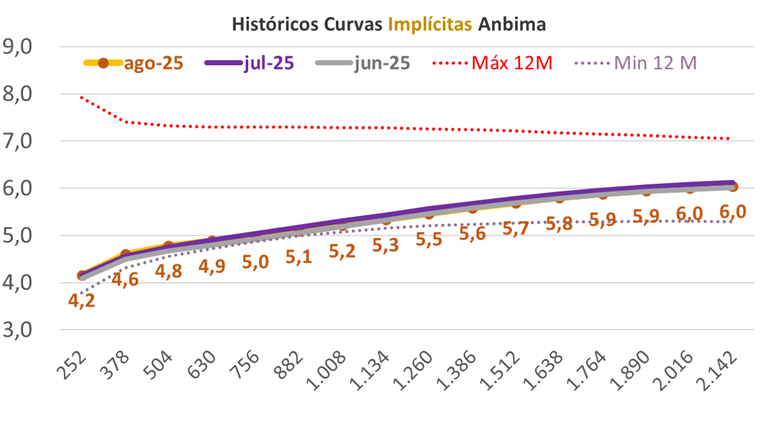 De volta ao cenário brasileiro, o mês de agosto também foi positivo para o mercado de juros futuros, a despeito do quadro fiscal desafiador e do aumento das tensões entre Brasil e Estados Unidos, que se estenderam do campo tarifário para o judiciário. Todas as taxas cederam, com destaque para o vencimento de janeiro de 2027, que caiu abaixo do patamar psicológico de 14%. O vértice abriu o mês em 14,21%.