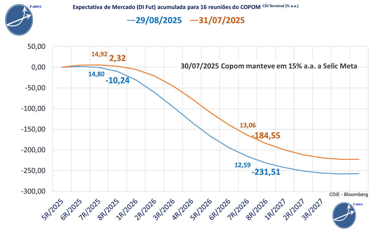 Em 30/07/2025 o Copom manteve inalterada a Selic Meta em 15,00% a.a., conforme o esperado pelo Mercado.