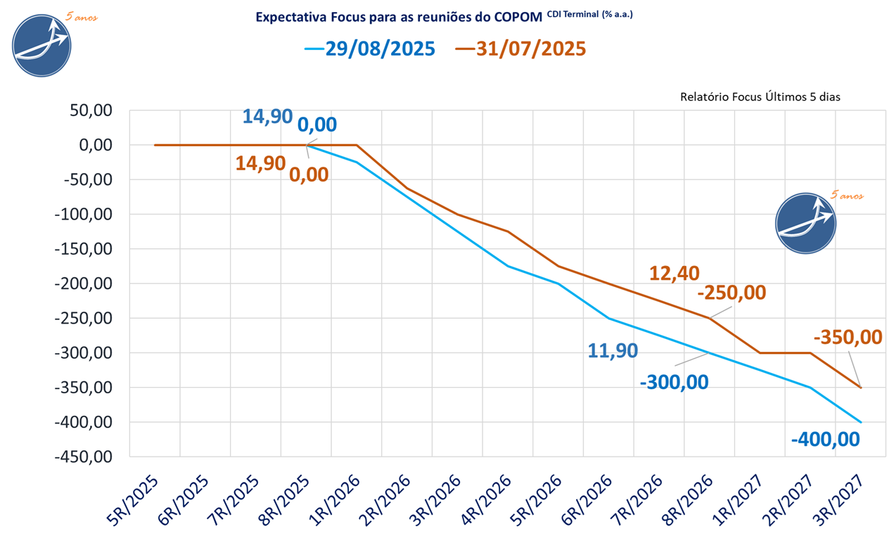 Para o fim de 2025, a expectativa foi para um corte marginal de -10,2 ptb de 2,3 pontos-base, com o CDI terminal projetado em 14,80% ao ano de 14,92% a.a. na semana anterior.